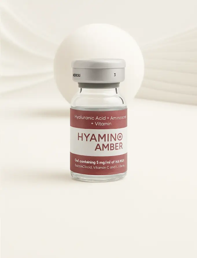 Hyamino Ambre is a clinic-grade revitalising treatment designed for aesthetic practices and dermatology clinics. It combines non-cross-linked hyaluronic acid with succinic acid and essential nutrients to support cellular function, hydration and skin structure. According to its product description, it “provides cells with vital nutrients for their proper functioning … a unique combination … helps improve the quality and structure of skin, significantly increases the level of hydration and minimises the number of free radicals that damage protein like collagen and elastin fibres.”